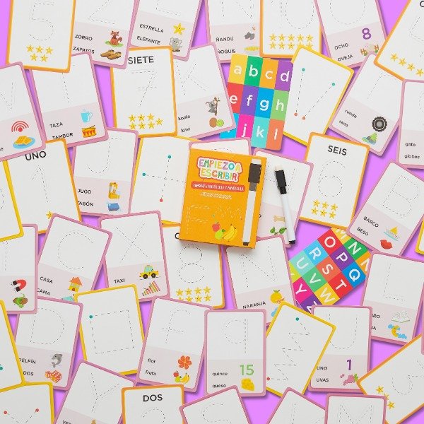 • Contiene todo el abecedario, ejemplos de palabras, oraciones para practicar y además un marcador con borrador.