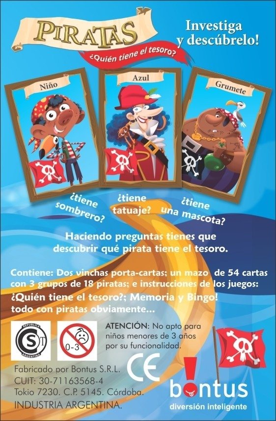 Dos vinchas porta-cartas; un mazo de 54 cartas con 3 grupos de 18 piratas; e instrucciones de los juegos: Quién tiene el tesoro?; Memoria y Bingo!