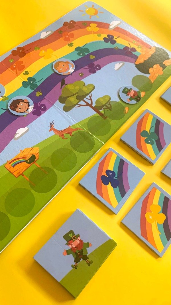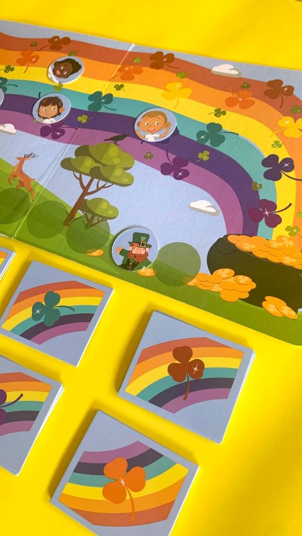 El recorrido lo hacen los personajes sobre el hermoso arcoíris según los tréboles de colores que van obteniendo. ¡Pero cuidado! el duende puede avanzar también y tratar de llegar antes.
