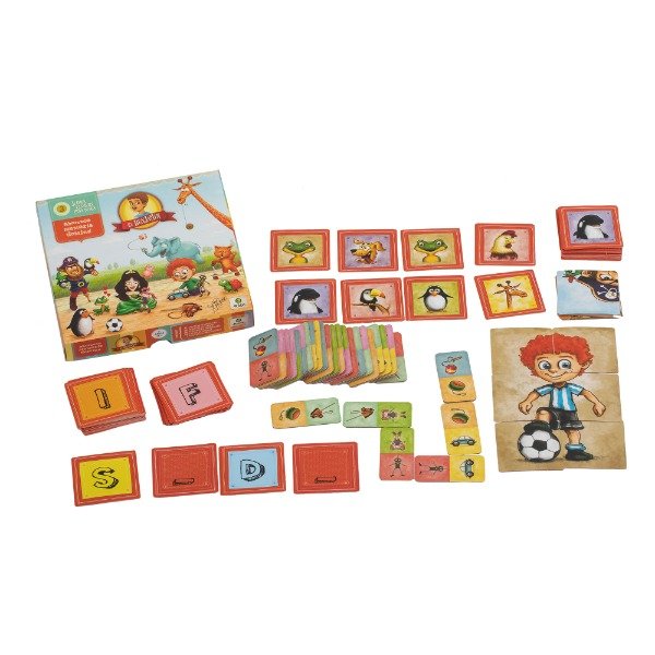 Contenido:42 tarjetas de animales / 90 tarjetas de letras / 32 tarjetas de personajes / 28 fichas de dominó / 18 dibujos para colorear
