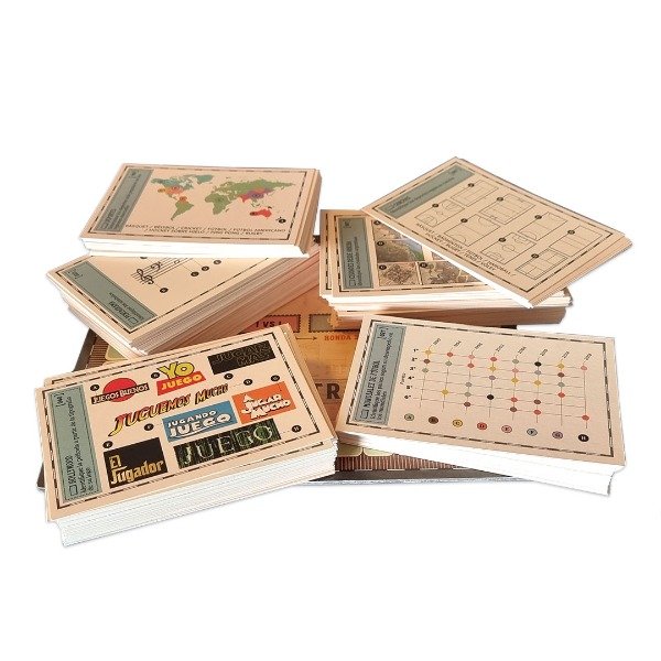 CONTENIDO: 1 TABLERO / 320 TARJETAS / 4 PEONES / 3 BLOCKS / 3 LÁPICES / 6 SOBRES / 1 REGLAMENTO / 3 TAPA TARJETAS