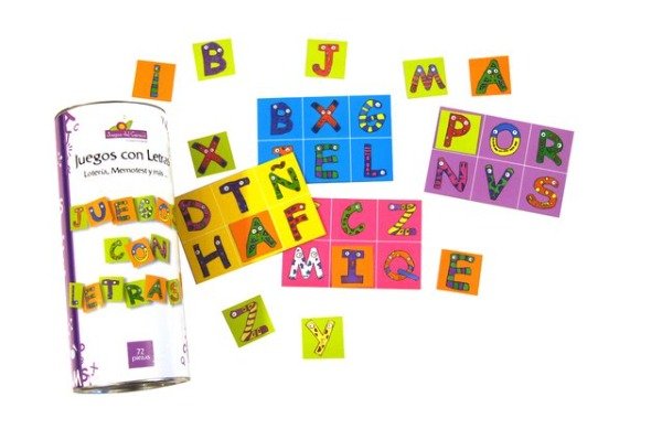 -72 letras ilustradas con vocales consonantes y signos + 4 tableros de loteria.