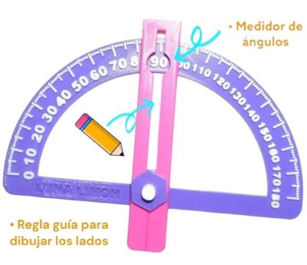 TRANSPORTADOR con regla guía deslizante para el trazo de los lados y medidor de ángulos en sentido horario.