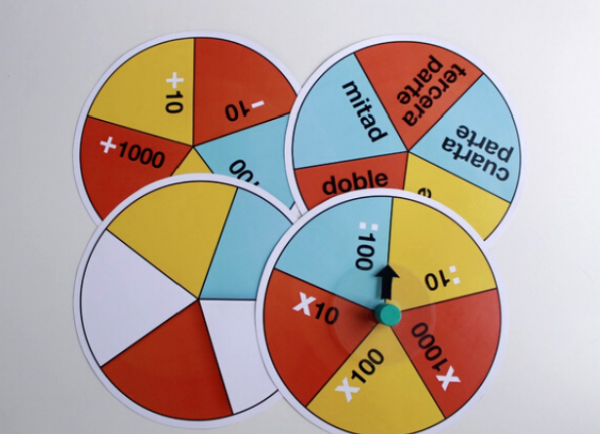 Cuatro círculos imantados de 30cm de diámetro con operaciones, una rueda magnética giratoria y un dado.