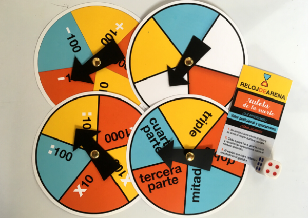 Cuatro círculos giratorios de 14cm de diámetro con operaciones y un dado.