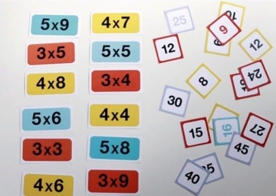 *99 fichas de 5cm x 5cm que representan las nueve tablas de multiplicar + fichas con resultados. Opcional imantadas.