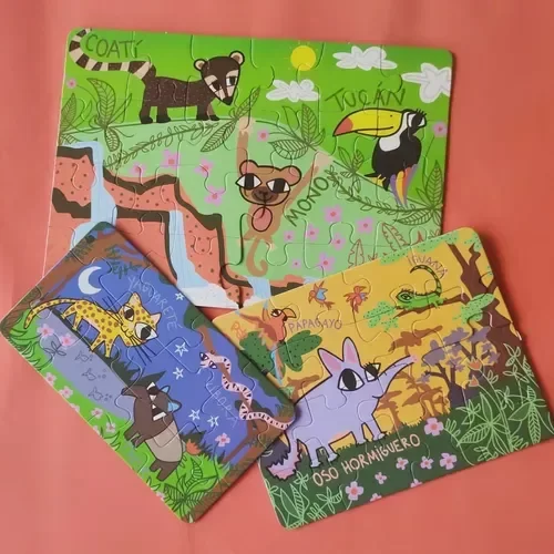 Incluye: 1 rompecabezas de 24 piezas "mono" + 1 rompecabezas de 12 piezas "yaguareté" + 1 rompecabezas de 16 piezas "oso hormiguero"