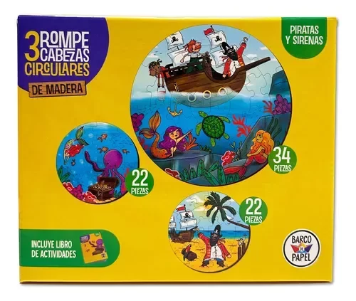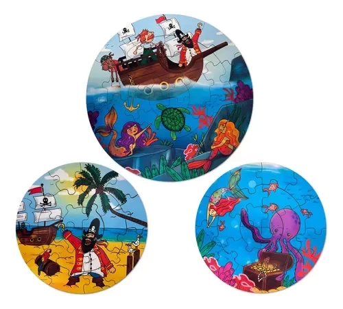 3 Rompecabezas circulares de madera piratas y sirenas.