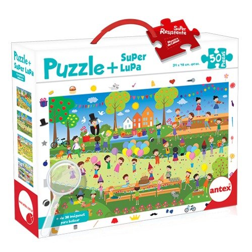 Rompecabezas de 50 piezas con lupa y juego de busqueda. Tamaño del pliego 34 x 48 cm aprox y pieza super resistente.