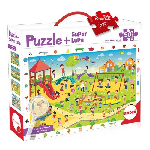 Rompecabezas de 50 piezas con lupa y juego de búsqueda. Tamaño del pliego 34 x 48 cm aprox y pieza super resistente.