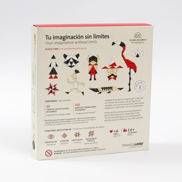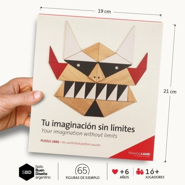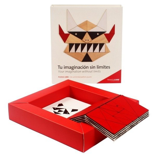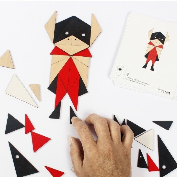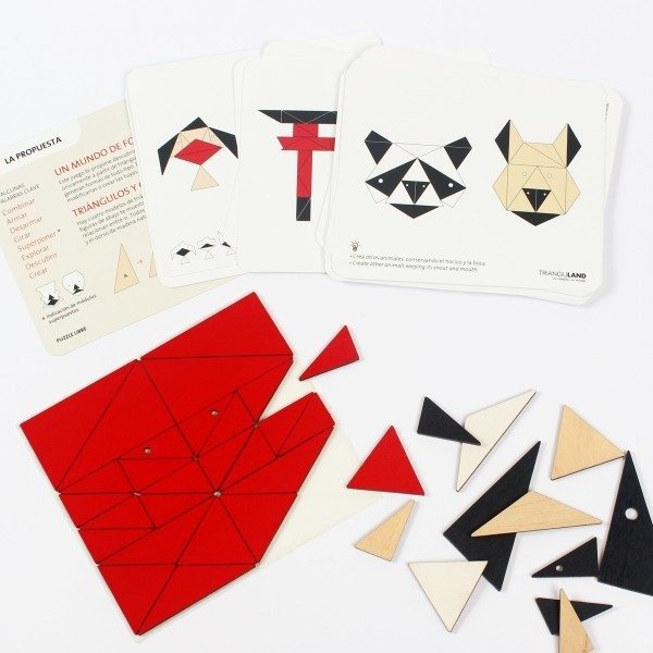 . Se trata de un juego para armar figuras combinando triángulos de madera de diferentes tipos, tamaños y colores.