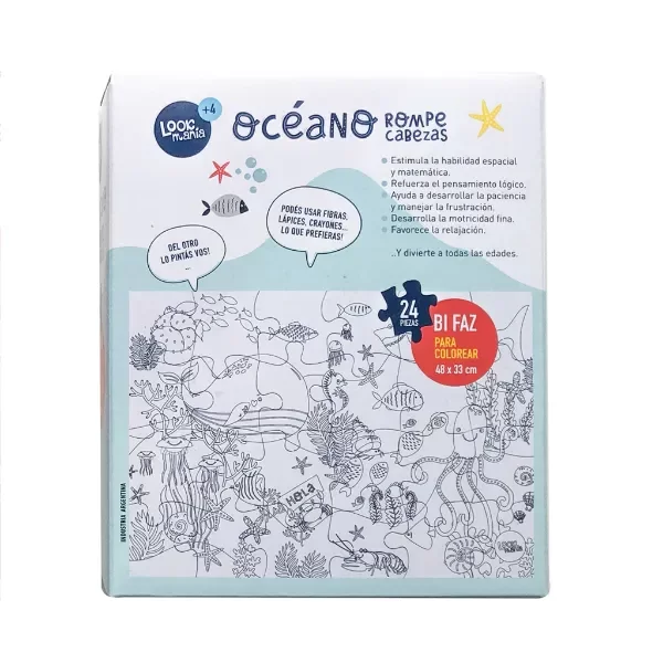 Medida: 48 x 33 cm. Contiene 24 piezas de cartón grueso. Es bifaz, de un lado es blanco para poder colorear a gusto.
